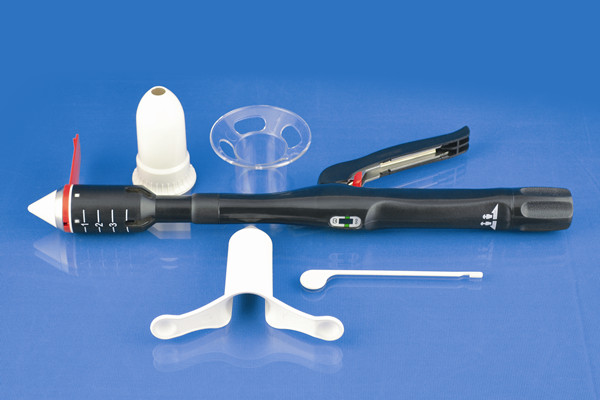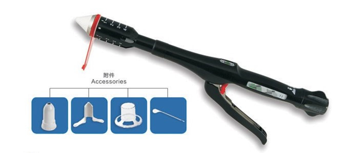 黏膜環切吻合器(qì),一(yī)次性使用(yòng)肛腸吻(縫)合器(qì)手術(shù)是(shì)以環形刀(dāo)将齒狀線上(shàng)方的(de)粘膜及粘$膜下(xià)層環形切除,同時(shí)擊入成圓形排列的(de)兩排互相(xiàng)交錯(cuò)的(de)縫釘将¶切口閉合。應用(yòng)該器(qì)械可(kě)以節省手術(shù)時(shí)間(jiān)、減少(shǎo)病員(yuán)出血、能(néng)更方便地(dì)進行(xíng)手÷術(shù)縫合。本器(qì)械有(yǒu)三種規格32mm、34mm、36mm以适應不(bù)同組織。